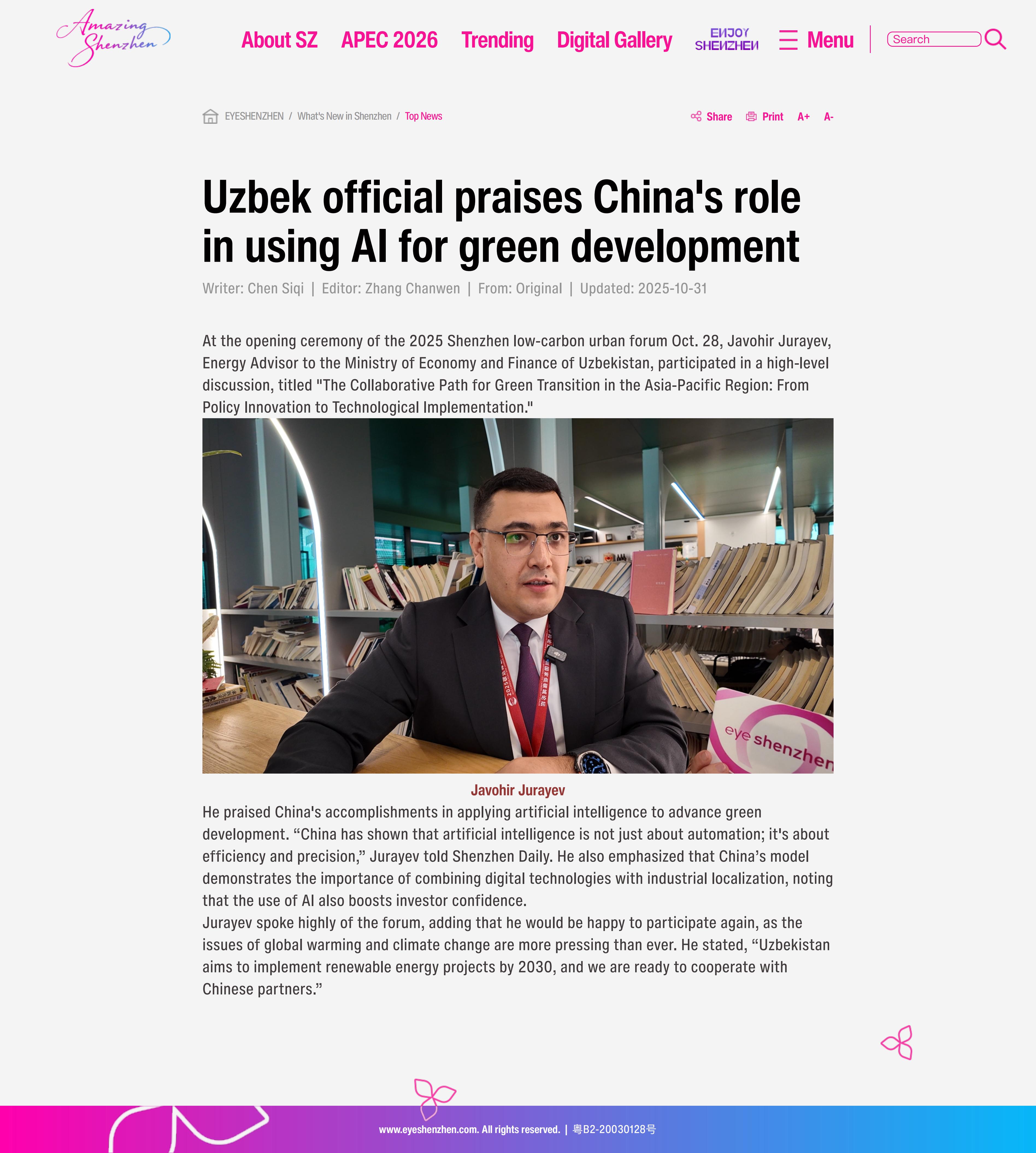 EYESHENZHEN|Uzbek official praises China's role in using AI for green development