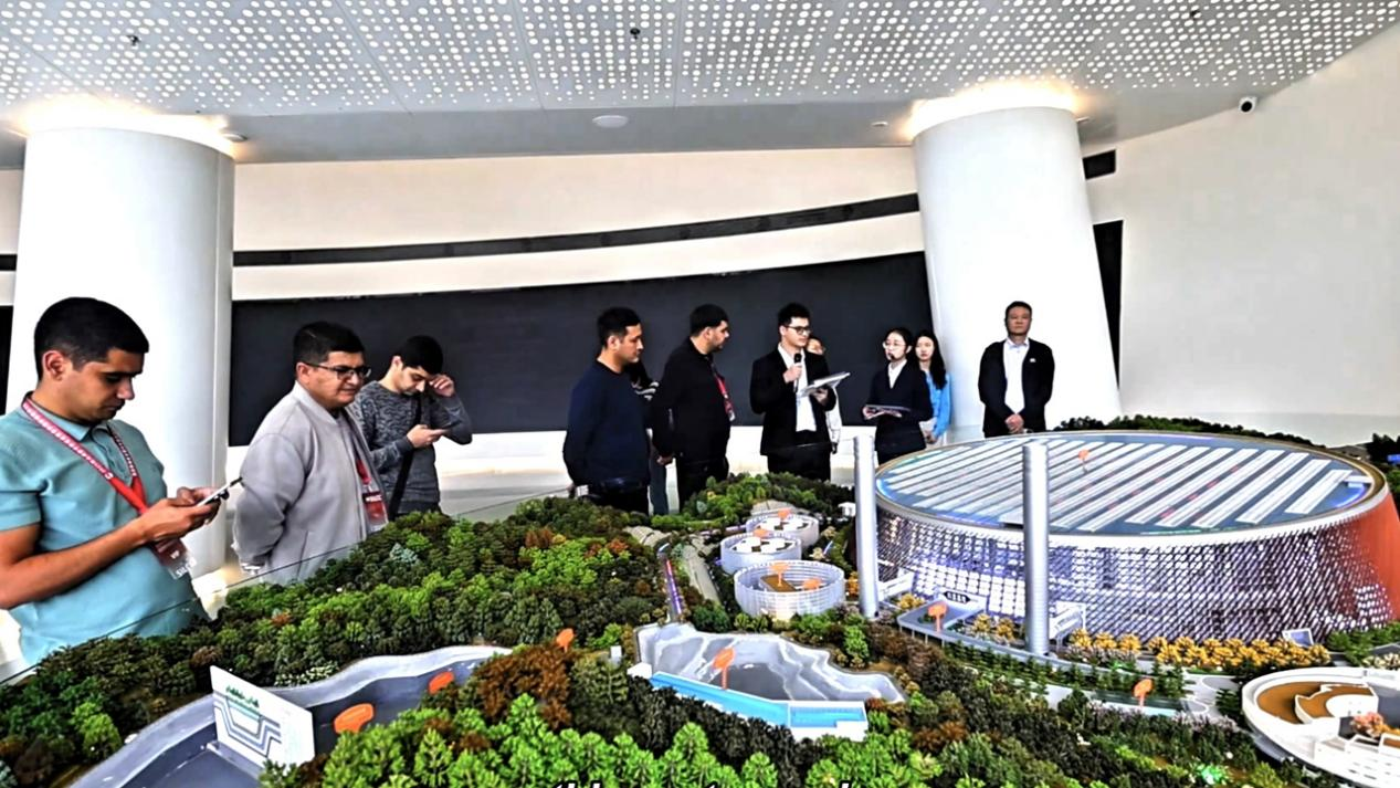 10月29日,乌兹别克斯坦代表团成员在沙盘旁听取龙岗能源生态园的介绍。